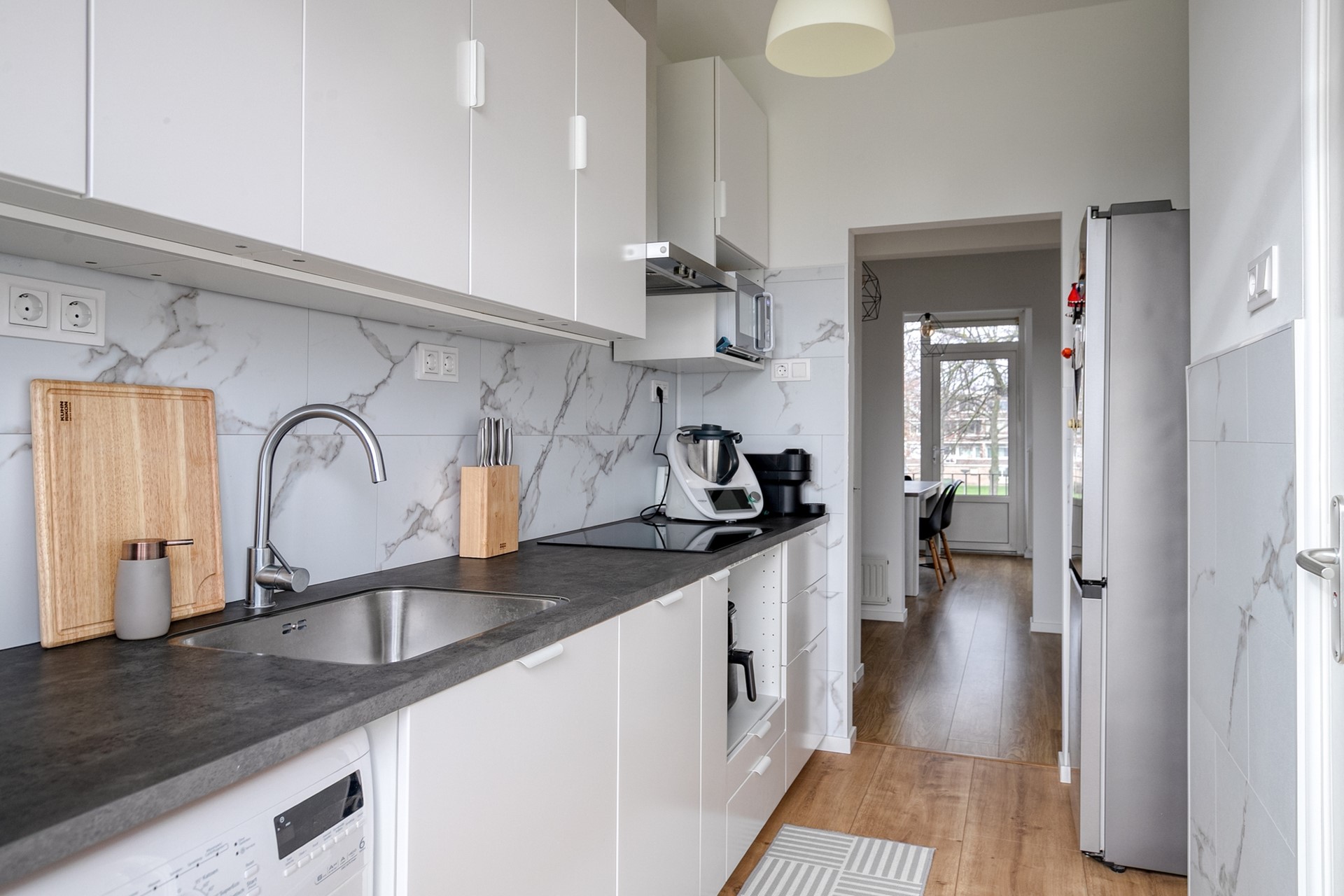 Open keuken (2024) met moderne, witte opstelling met marmerlook achterwand. Voorzien van spoelbak, vaatwasser, gaskookplaat, afzuigkap en aansluiting wasmachine. Deur naar het royale balkon aan de achterzijde met een vrij en groen uitzicht over een ruim grasveld.