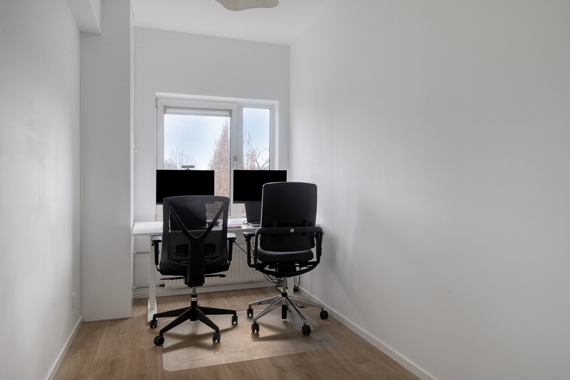 Aan de rechterzijde de eerste, moderne en licht afgewerkte slaapkamer met maatwerk inbouwkast ten behoeve van de c.v.-installatie. Voorzien van nieuwe laminaatvloer, stucwerkwanden en -plafond en alle c.v.-leidingen weggewerkt.