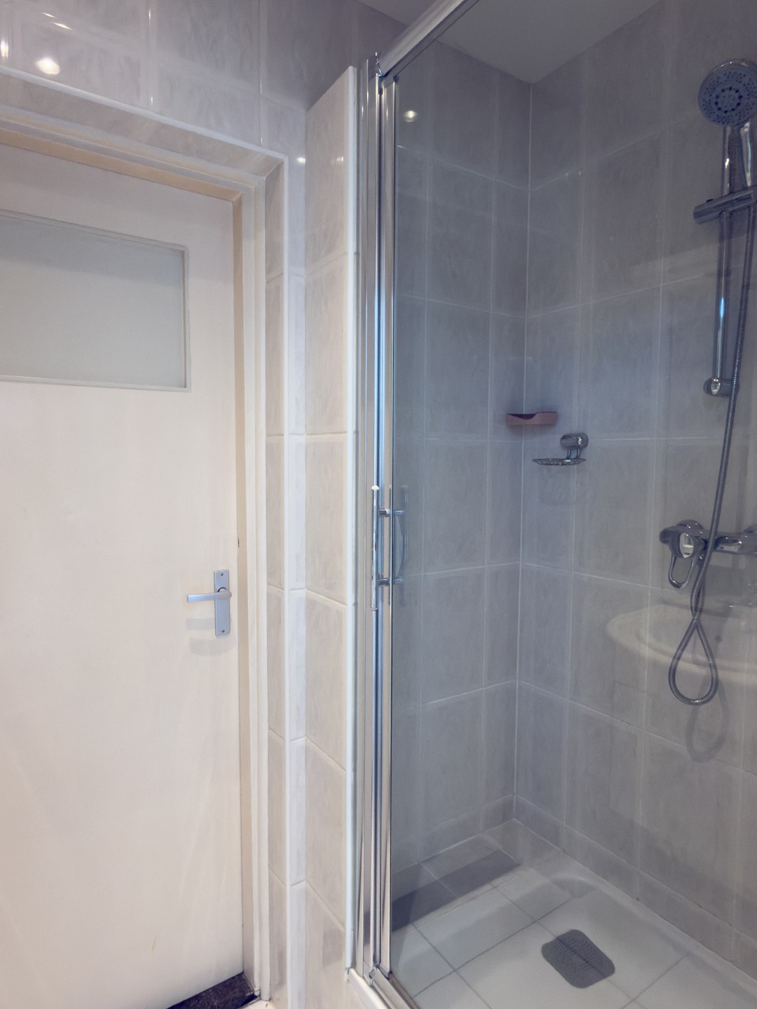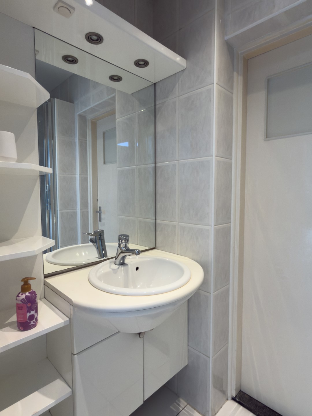 De badkamer is verzorgd en voorzien van een wastafelmeubel en separate douche.